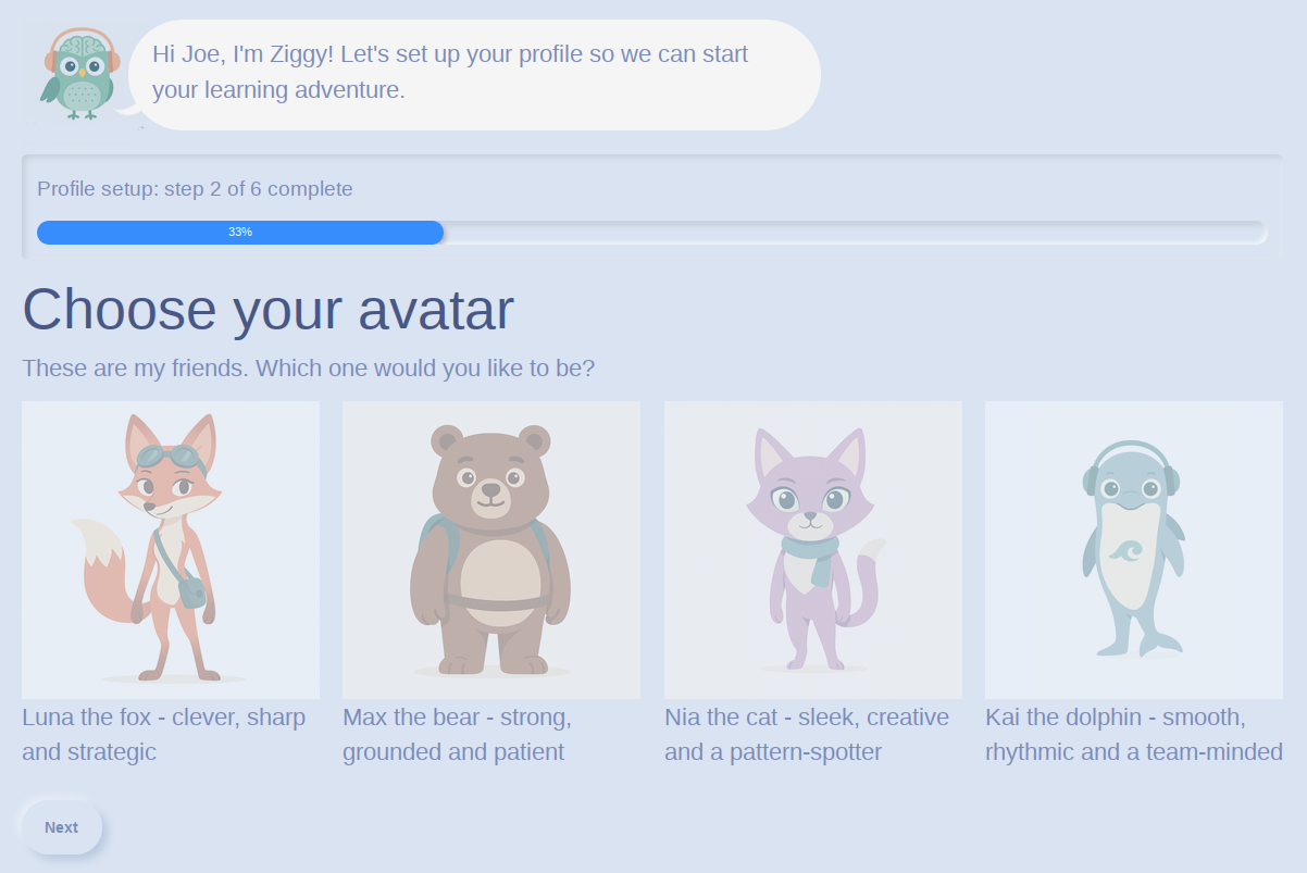 Then choose preferences for a theme, avatar, voice and most importantly HOW you like to learn. This will be used to tailor the questions to your preferred learning style.